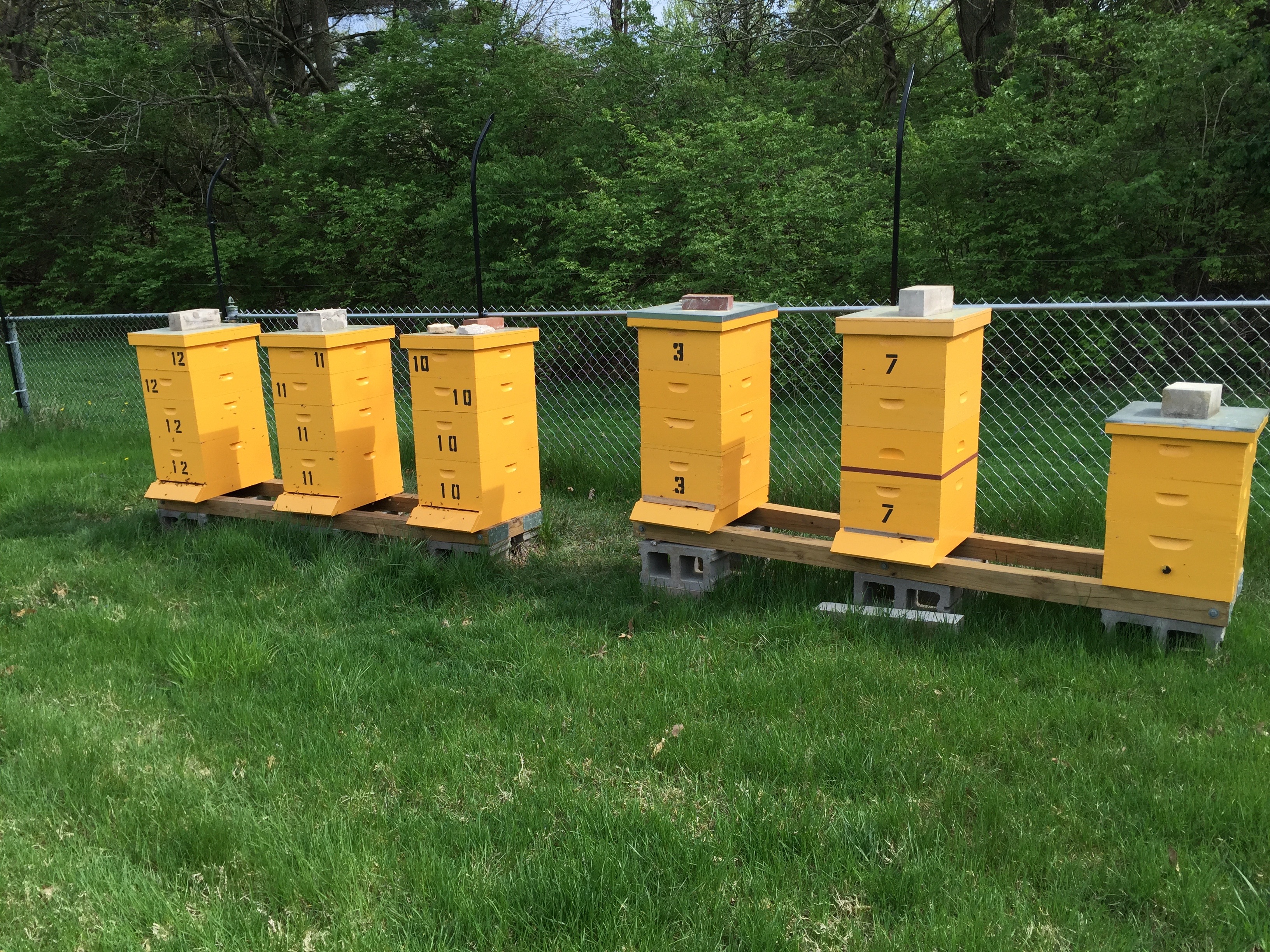 Since then we have continued to foster the newer colonies by feeding them sugar syrup to ensure that they have a food source until the nectar flow increases in the blooming season. Yesterday we visited all five bee yards and added honey supers on top of all of the deep brood boxes. These honey supers are boxes which contain 10 frames each that the bees will draw out with comb and then fill with honey and cap with wax. Many of Jurgen’s frames are already drawn out which is a great advantage! In order to encourage the bees to get to work on this process, we sprayed each frame with sugar water. It was a good day of beekeeping since the weather was nice enough that we weren’t sweating to death in our heavy suits and carrying around empty honey supers is much lighter work than it will be in a couple of months from now when we hope to be lifting these same supers off to harvest around 4o lbs of honey from each box. Here are the hives at Seven Oaks. There are 5 active colonies with a spare hive for expanding later in the season. Hives 3 and 7 are the newer ones, and still have entrance reducers in the front opening since these colonies are not strong enough yet to protect their entrance from possible intruders.