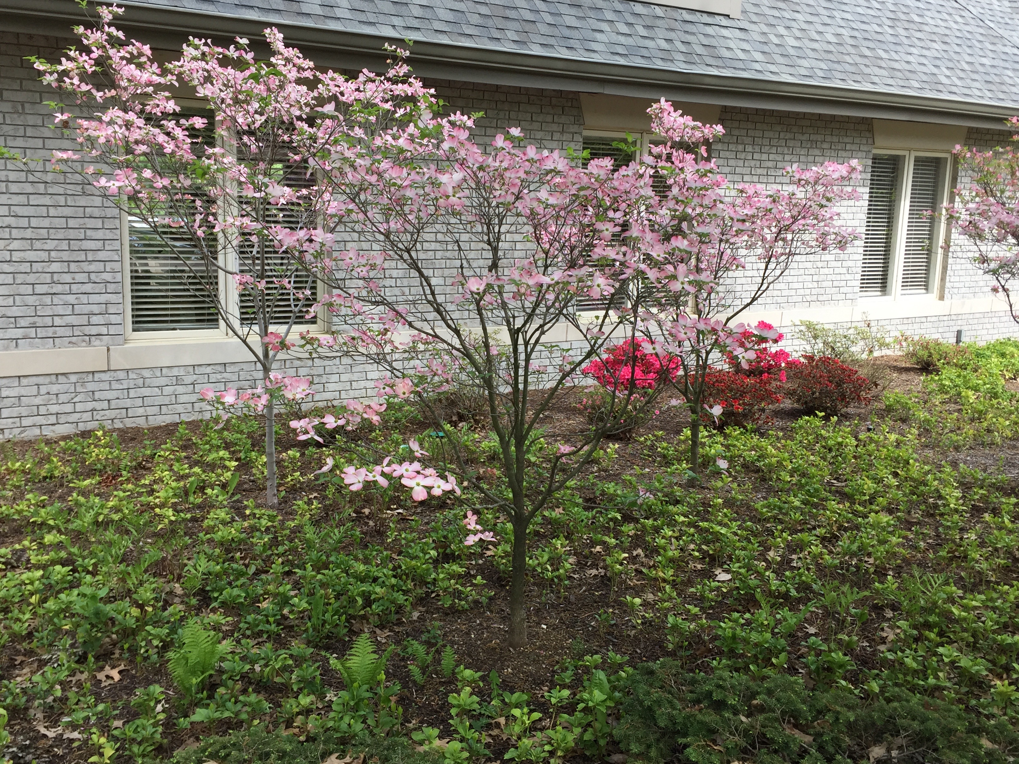 After a good spring clean up the landscape beds are full of spring promise as well. The Portuguese laurels look as if they benefited from last winter’s burlap protection and promising new leaves are evident as well as flower buds. The blooming dogwoods and nearby azaleas are accented by tender, young ferns popping up in the undergrowth. All 45 of the Double Knockout roses are leafing out nicely after their first feeding and promise to provide color all summer long. We have added some organic material to the flower beds and ornamental trees in the front landscaping. The pachysandra ground cover is particularly hungry for this supplement.