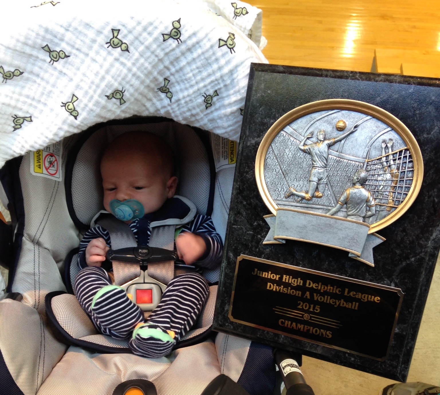 Baby Coulter has a growing fan club so I must include some pics of him here. He was two weeks old last Wednesday and already attended his first volley ball championship which his dad, the coach, handily won with his team. Cal was so excited, they had to calm him down with a binky!