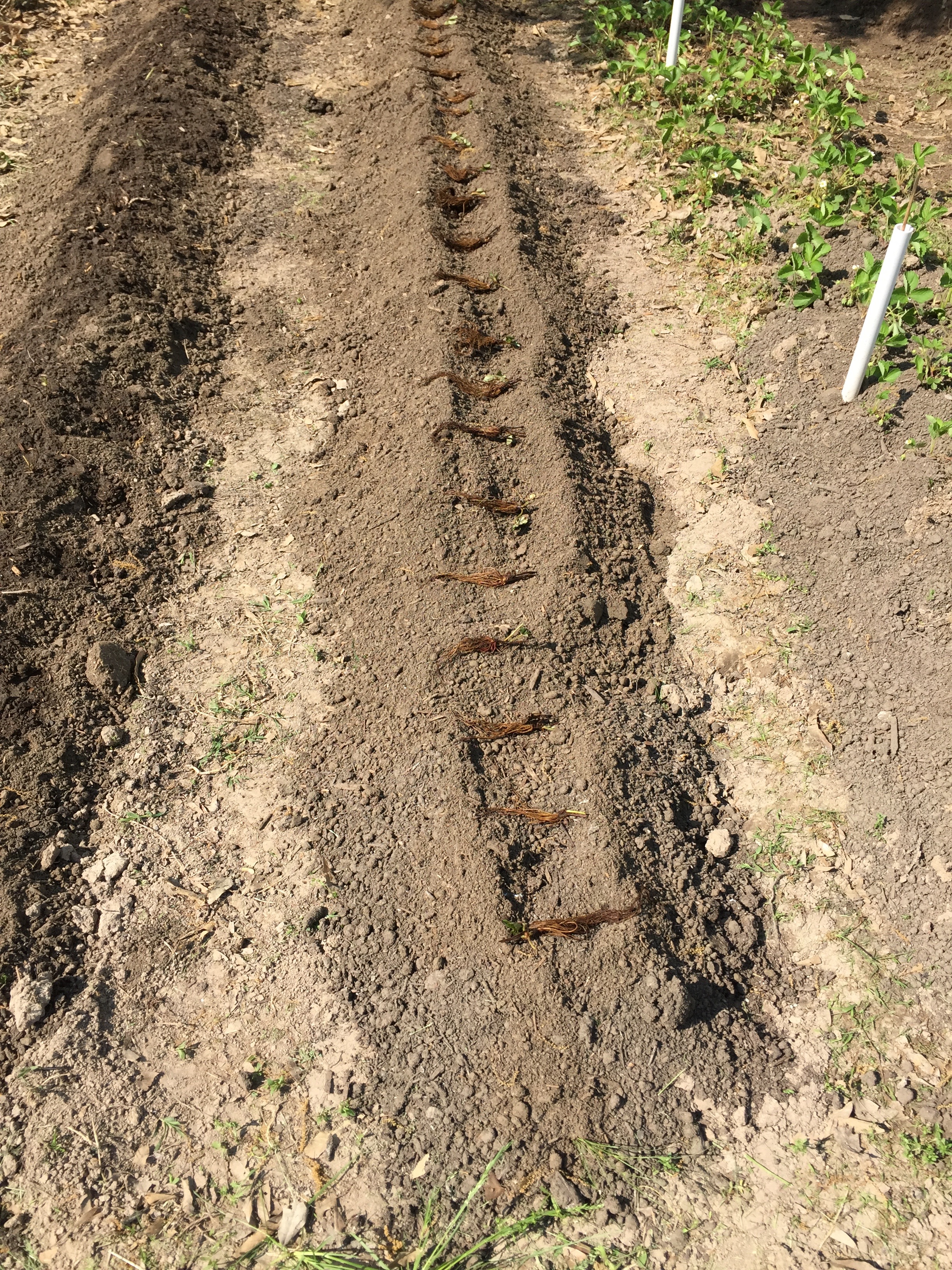 In addition to that, we renovated the strawberry field by re-arranging a couple of rows of plants. Ever since we plotted this field, I’ve been sorry that we didn’t plant this crop in raised berms. So, with the idea of adding new strawberry plants on a continual basis to supplement the old, we decided to re-work our two worst rows of plants by digging up the existing, (albeit meager) strawberry sets and transplanting them to higher ground in other rows, and then devising to plant new rows of strawberries after creating berms in that field. LOTS OF WORK TO DO THIS!!! But, here are the two new rows ready to go with one of the rows showing the dry root plants sitting on top, ready to nestle into place.