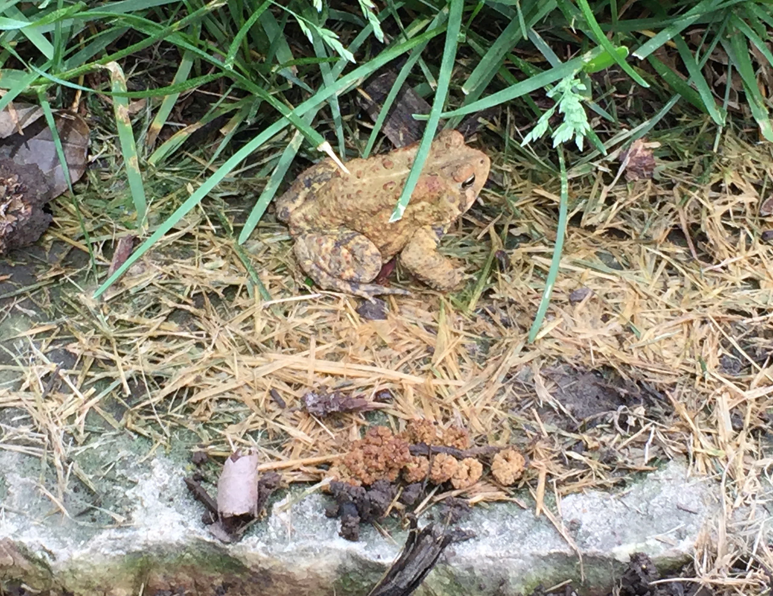 Between spurts of rain we managed to get more mowing done and I tackled some much needed weeding in the Trident Maple areas. I love the little critters I encounter along the way. Look at this little toad…he is so well camouflaged that I jumped when he moved right near my workspace. IMG_7839 (1)