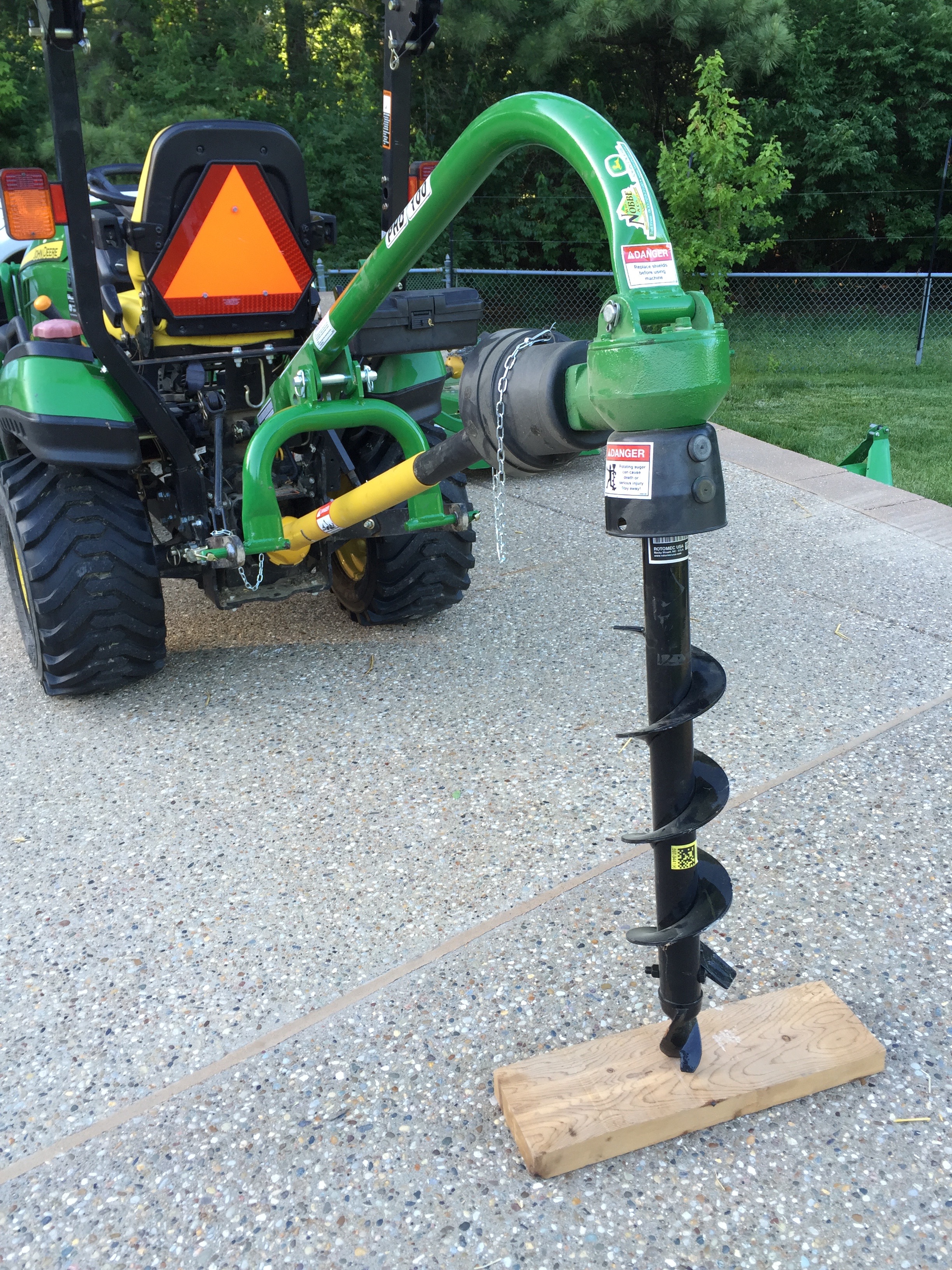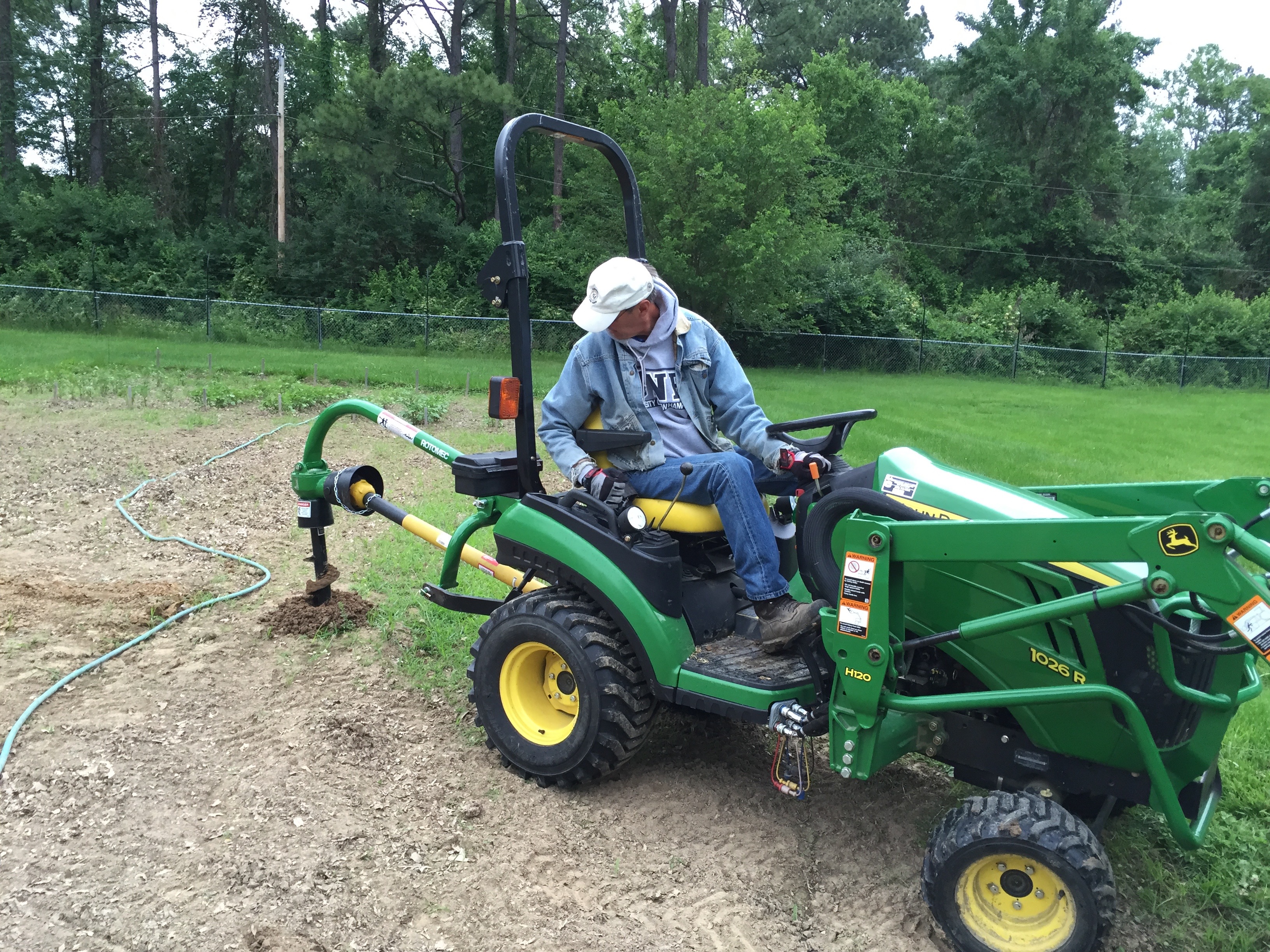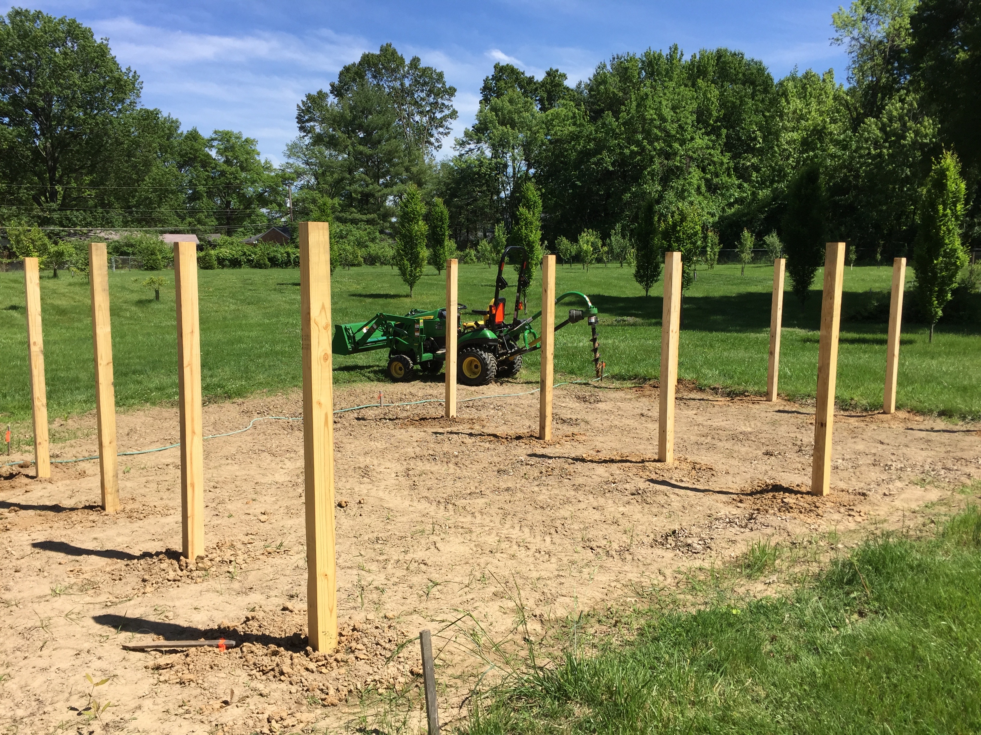 While I was doing this, Dave was focusing on the new tomato staking method. This entails “planting” 8 foot tall 4×4 pine posts (untreated, of course) into the tomato field which will be used for plant supports. Dave did this using the new PTO driven post hole digger.