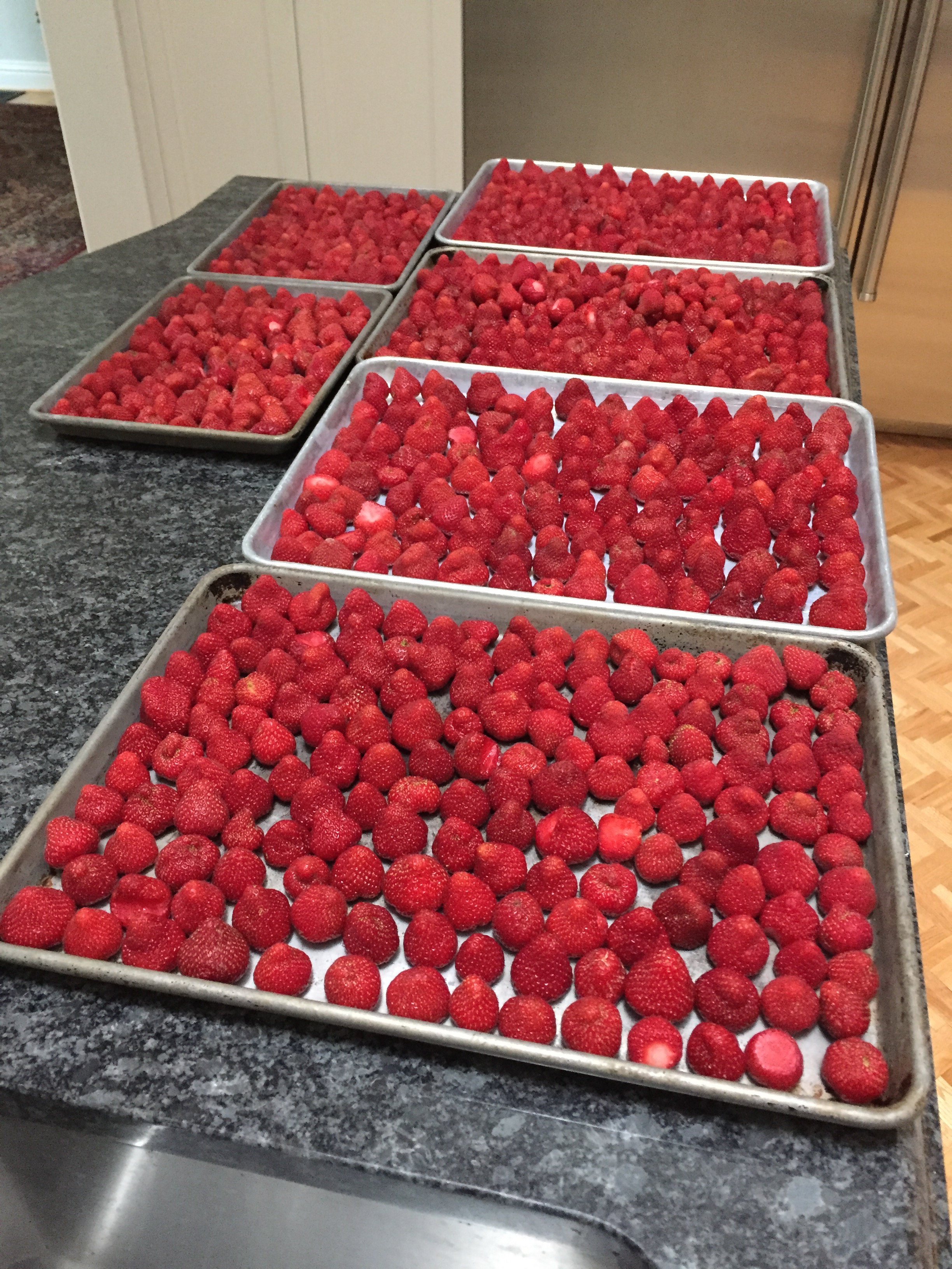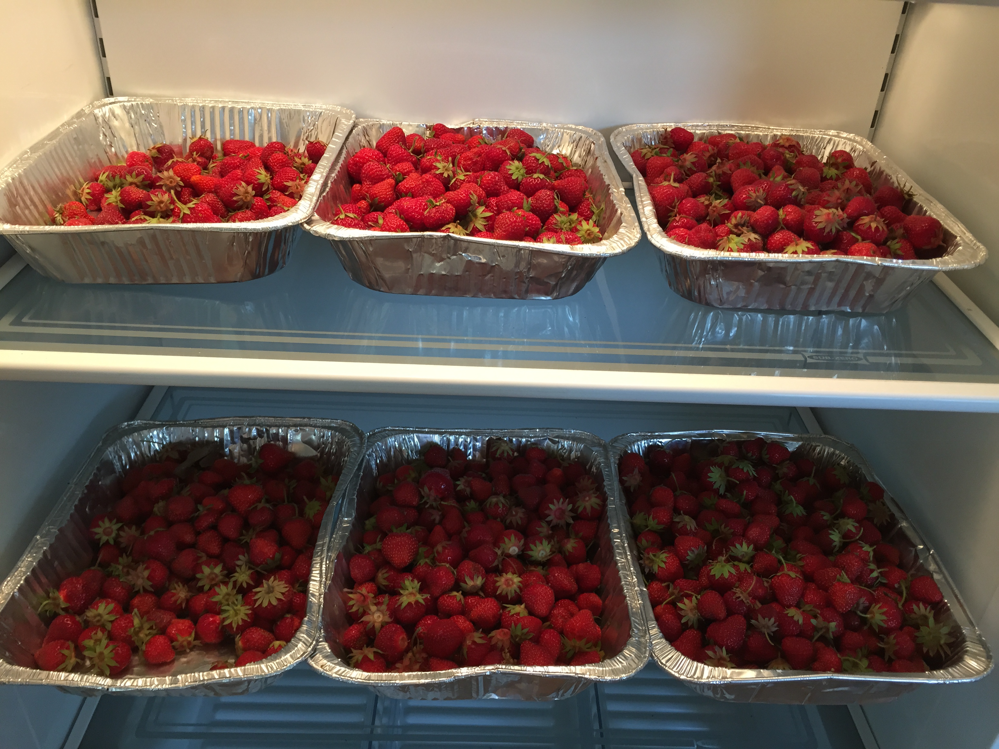 Here are what the last two days worth of berries, (approximately 20lbs) looks like as they sit in one of the refrigerators, awaiting my attention to prepare them for future keeping. Each tray is shouting, “me first” so I do what I can as fast as I can since ripe, home grown strawberries do not have a long shelf life. The reason for this is that when picked at a ripened point, the sugars in the fruit are at the highest level and the cell walls begin to break down quickly, making for a mushy fruit if not dealt with quickly.
