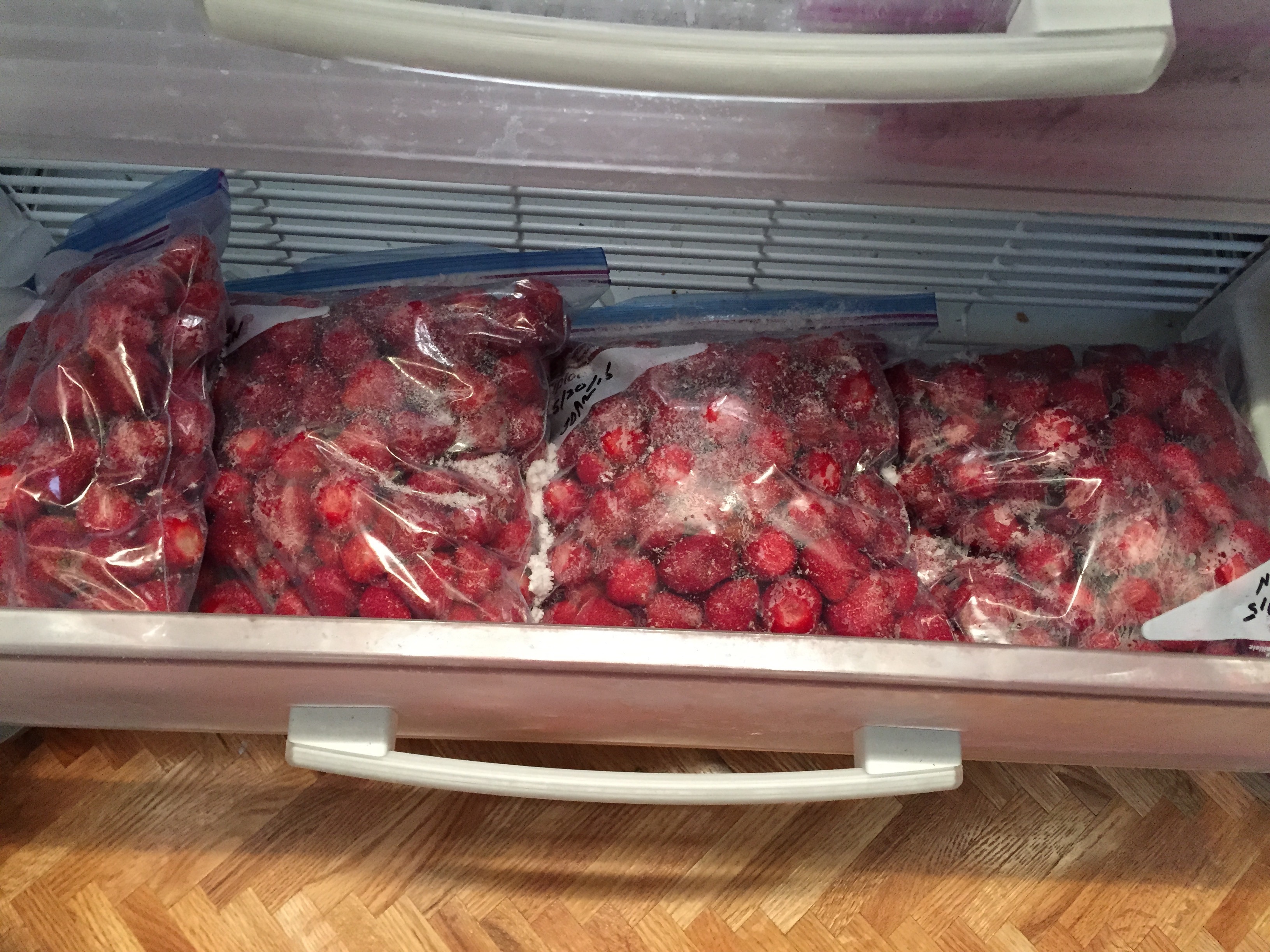 After they firmly freeze on the sheet pans, they tumble, rock-like, into freezer Ziploc bags and are layered back into the freezer drawers. Many more of these to come in the next days!