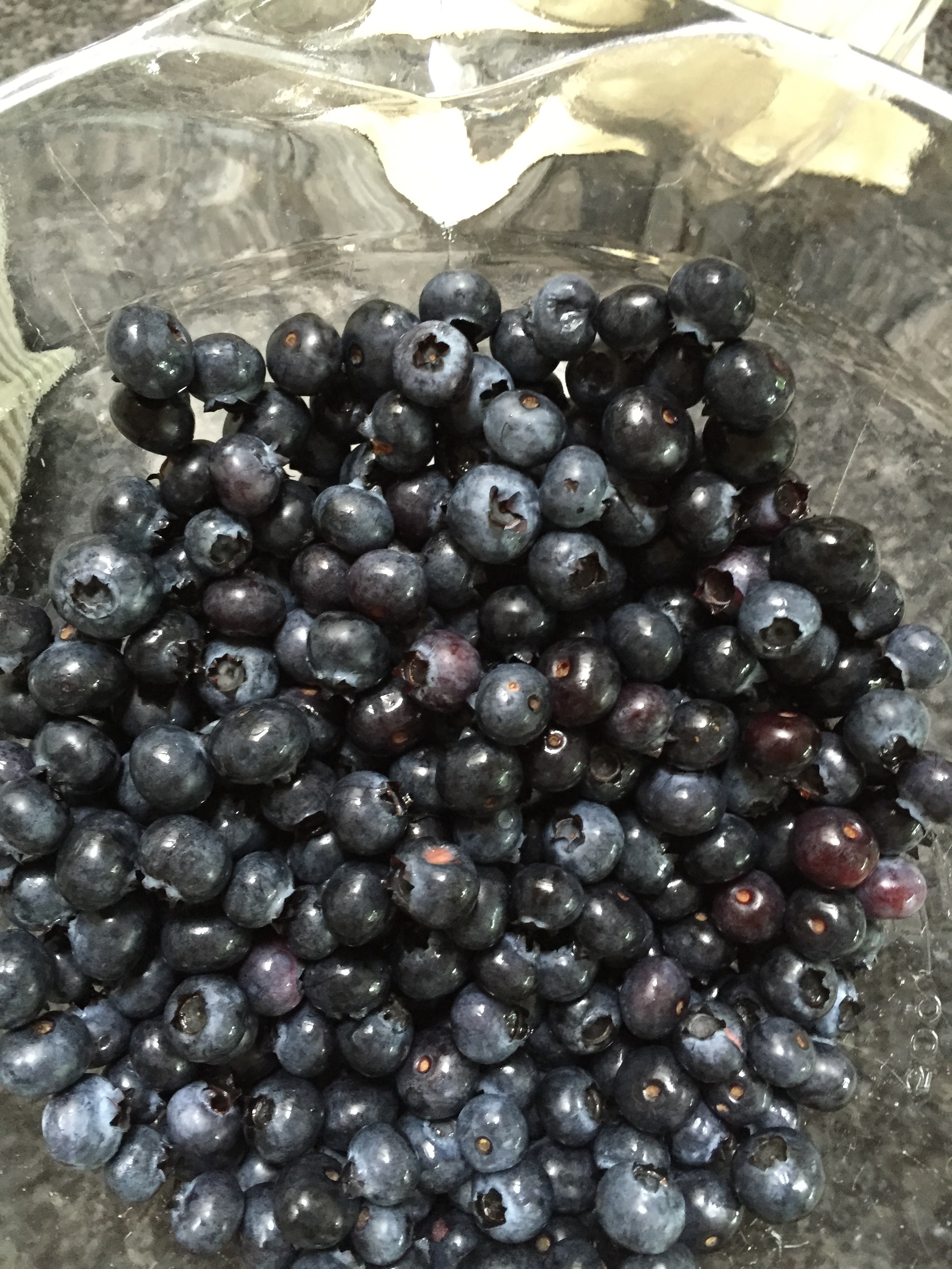 But, with so many blueberries to eat and freeze this year it is interesting to distinguish between the 5 varieties as far as flavor, in addition to size, color and volume of production. Now that we have eaten our fill of fresh berries and frozen as many as we can, I decided to make blueberry jam this year and am using some of the smaller fruit varieties that are very flavorful to do so. I have made this jam using one variety at a time and noting which jars contain which variety (not so for the strawberries) so it will be interesting to see if any distinctions of flavor and texture are apparent to the average taster. Here are some of the washed up berries ready for jam making. Their skins are so dark, but their flesh is quite pale.