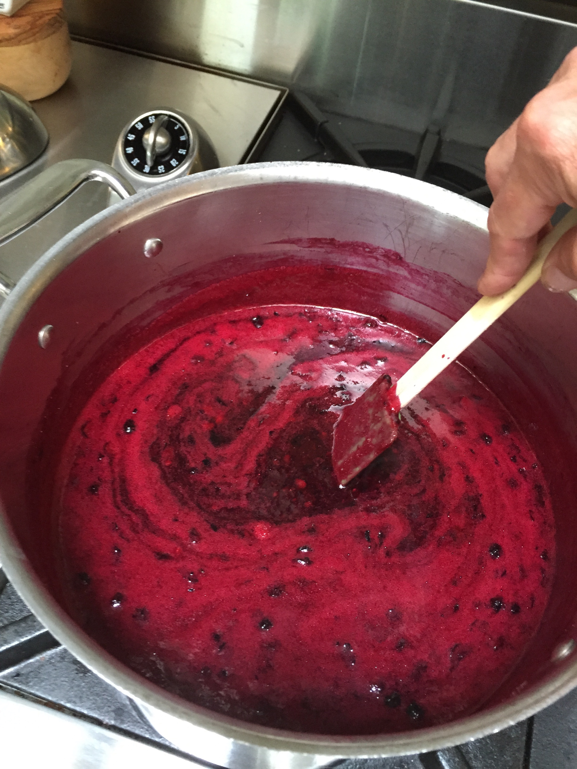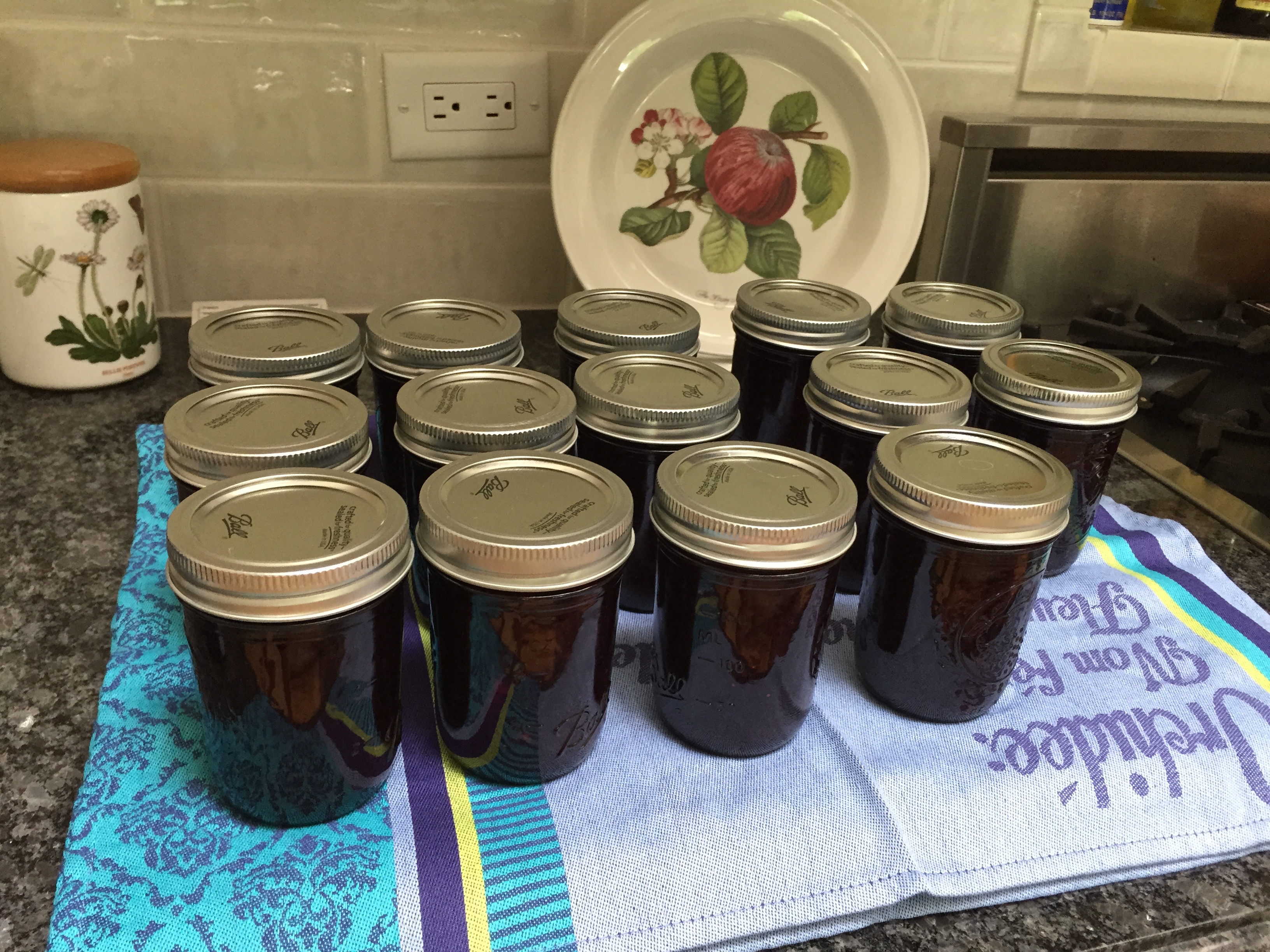 Once the fruit and sugar mix comes to a boil that you “can’t stir down”, the mix boils for 1 minute before shutting off the heat and scooping this very hot, syrupy mix into the waiting jars. It is amazing to see the deep purple/blue color evolve thru the heat process. You have to work fast so that the mixture doesn’t begin to thicken prematurely. The jars then go into a hot water bath for 5 minutes before they pop out to cool and self seal. I just love the popping of the lids when the vacuum takes place.