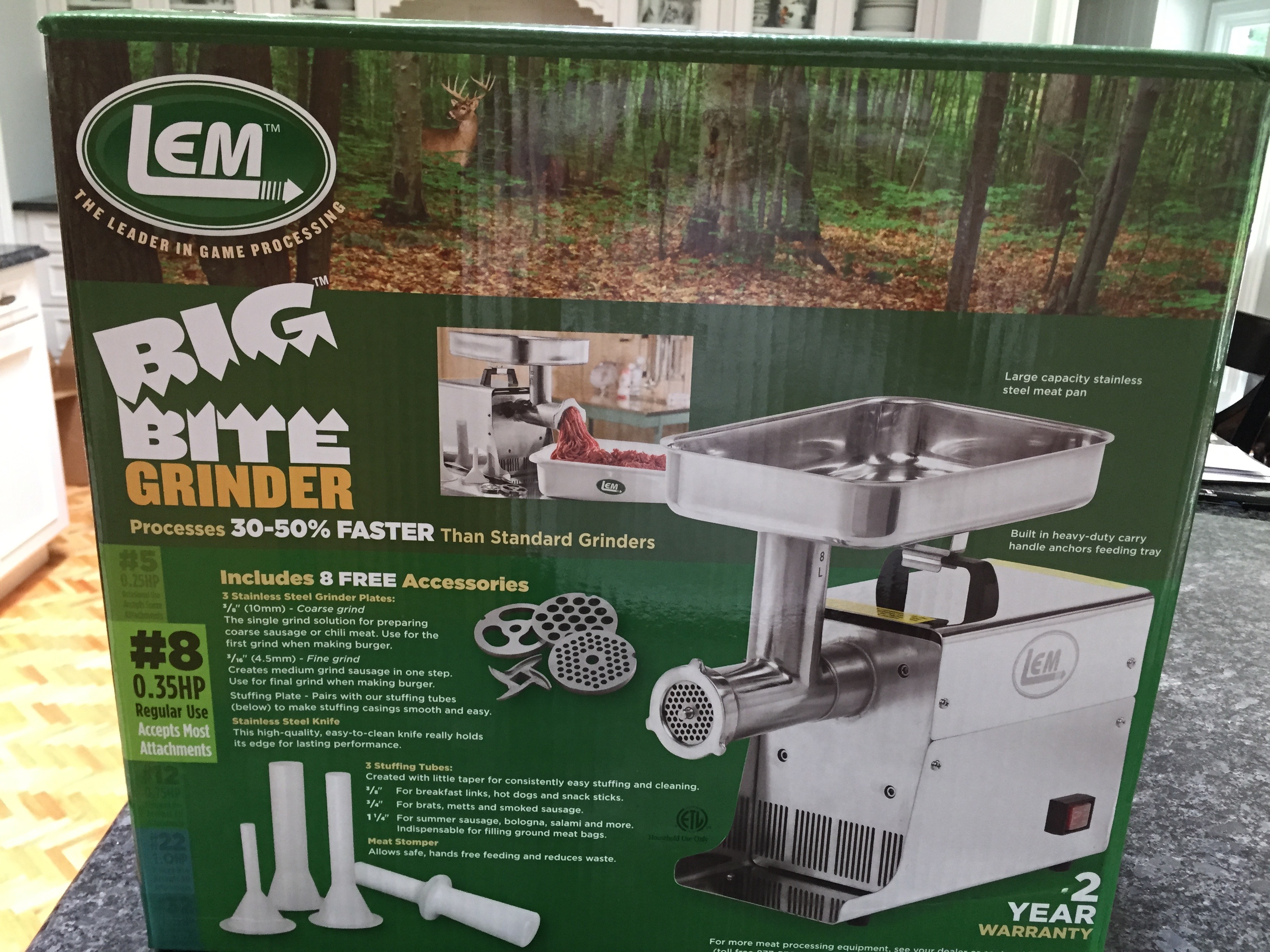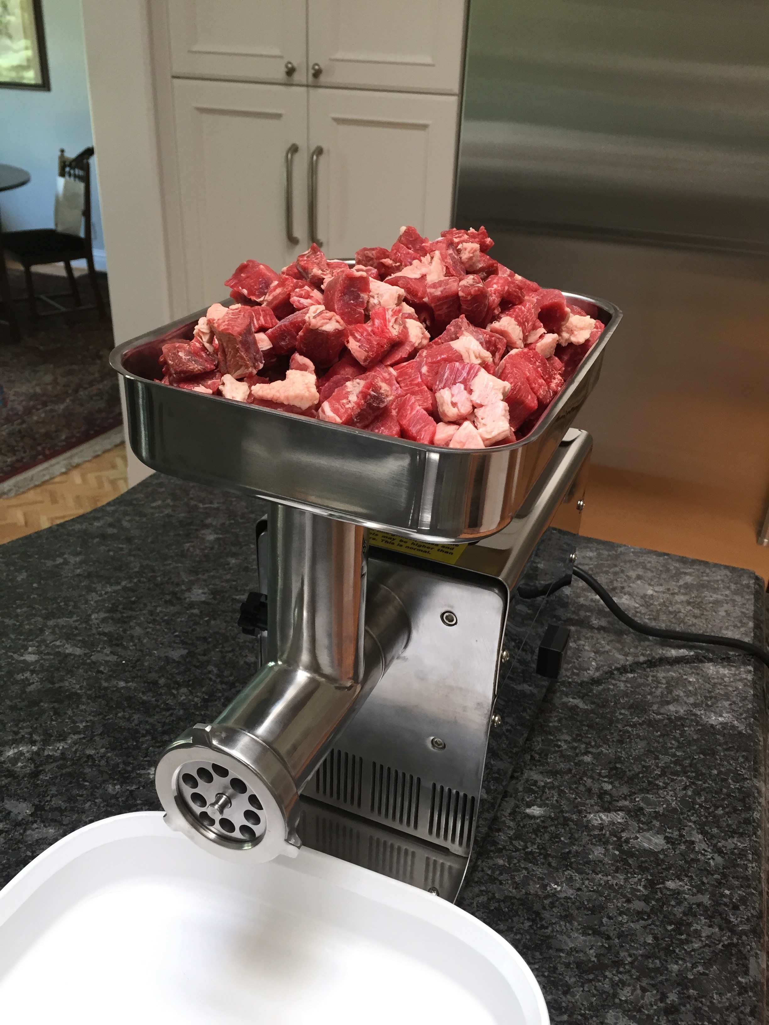 The brisket burgers from last month were such a big hit here that (with a little encouragement from the Wards) we did some research and ordered a nice electric grinder from a company that sells a model for every type of consumer. It arrived one day last week. Thank goodness Dave was here to lug it inside since it is heavy!.