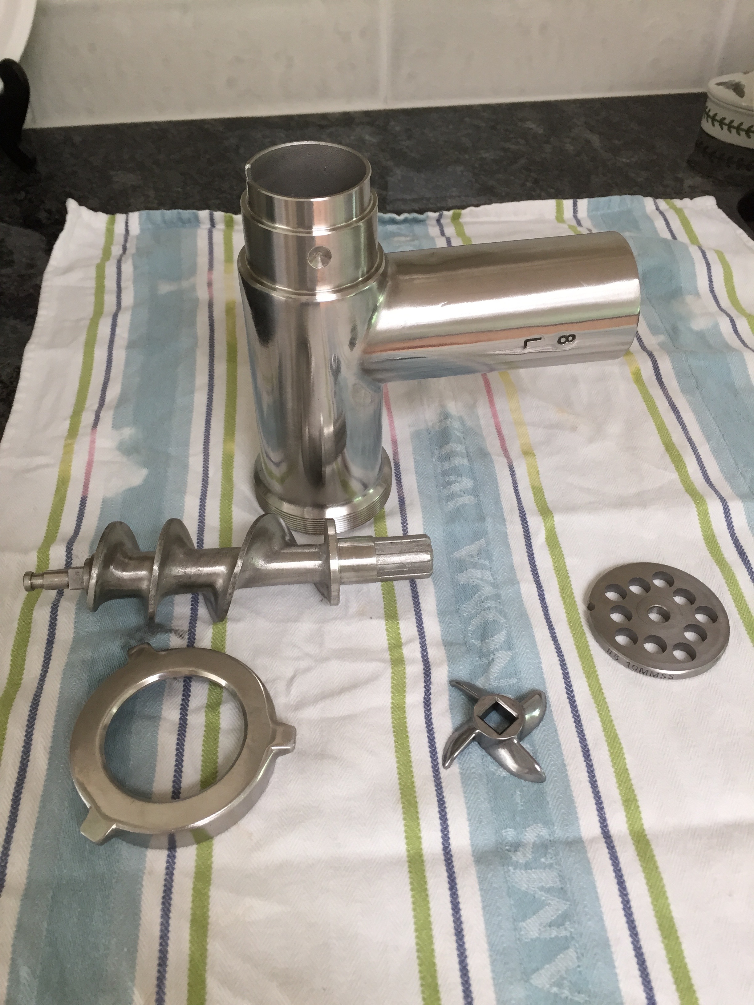 So we bought another brisket which I cubed and put into the freezer to firm up for an hour. I think 30 minutes would have been enough so that will go into the mental notes for next time. Of course I thoroughly washed all the working parts to get the industrial grease cleaned off before the first use and let them dry.