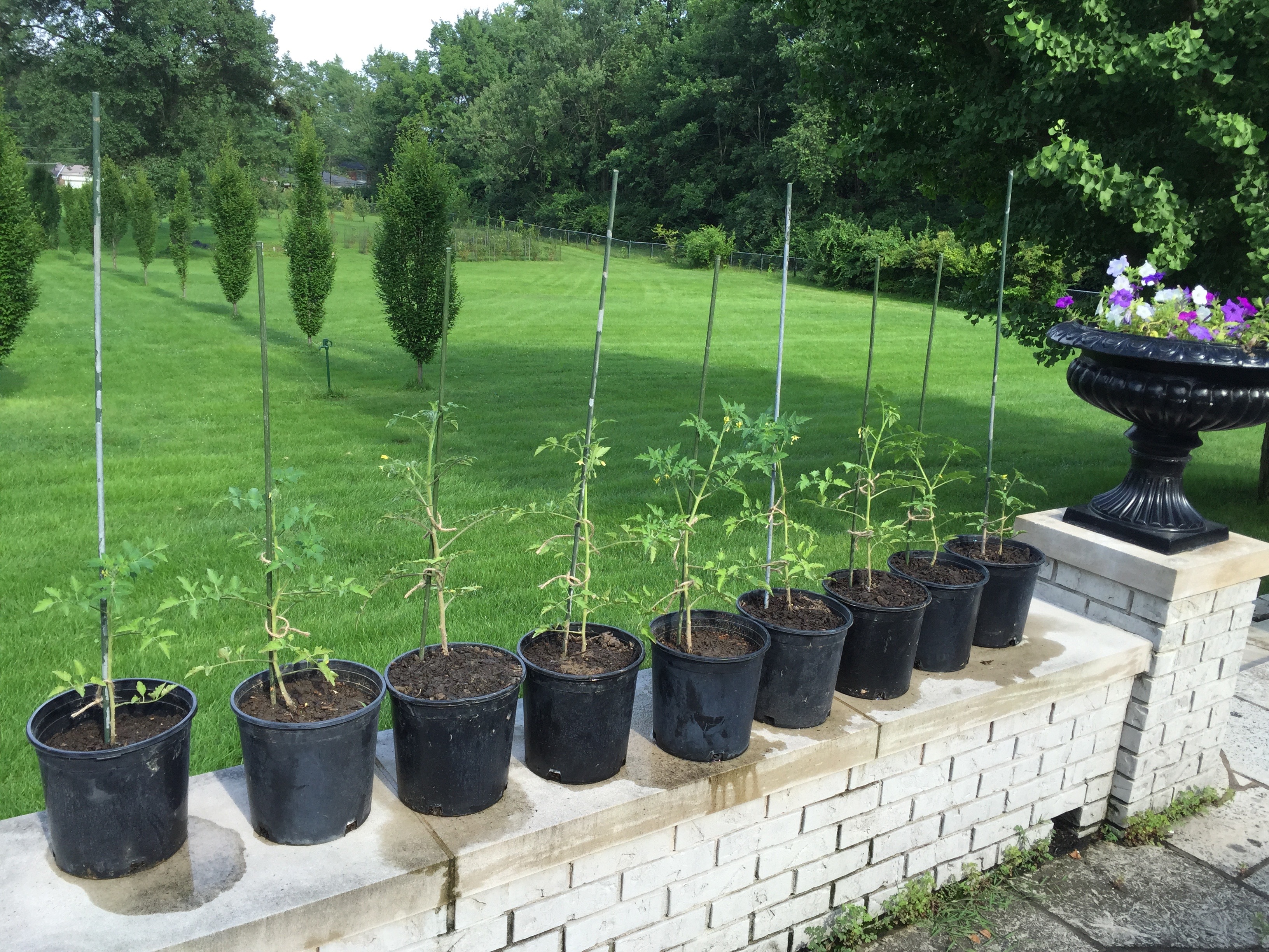 We are finding small windows of time to do whatever chores are left for us to accomplish outdoors. My friends have gotten used to me prefacing everything by only committing to doing things according to the rain status. “Sure I can join you, but only if it is raining!” Otherwise, I am scrambling to pick berries or work in spots that are still accessible. Although the fields look like swamps and have standing water, Dave has managed to work with what he can in the tomato patch…or what is left of it. Despite the dismal conditions, mother nature has allowed many volunteer tomato plants to sprout from the seeds of last year’s plants (shhh, don’t tell Monsanto!) and from those, he has potted a few that might produce some fruit this year! It will be fun to figure out what varieties these are since some already have blossoms and the bees have found them! At least they are able to drain as they sit on the back terrace wall.